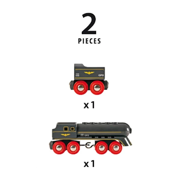 Train grande vitesse Dès 3 ans Montez à bord, installez-vous et commencez un petit voyage dans le temps à bord de cette locomotive classique. Le train est chargé à bloc et prêt à s’élancer. Le wagon à charbon est rempli et les moteurs tournent. Prêt pour le départ ? Caractéristiques techniques :