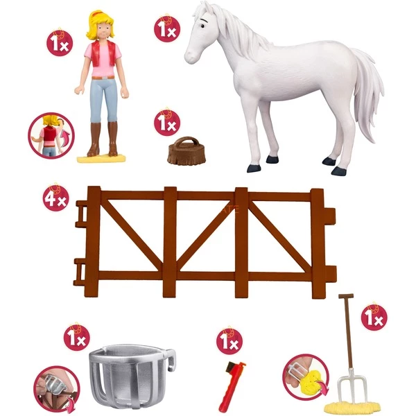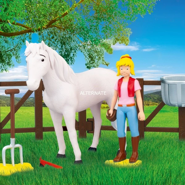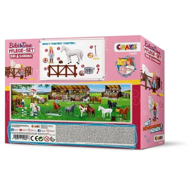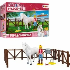 L’ensemble de soins Bibi & Sabrina fait battre plus vite le cœur de tous les fans de BIBI & TINA – car en plus de 2 figurines de jeu exclusives (Bibi & Sabrina), l’ensemble offre de nombreux autres accessoires tels qu’un bâton, un grattoir à sabots, une fourche avec du foin ou un panier à foin, dont Bibi a besoin pour prendre soin de sa jument Sabrina et avec lesquels de grandes aventures peuvent être reconstituées sur le Martinshof.