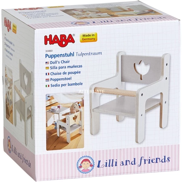 Un très beau coin salon pour les poupées est la chaise de poupée HABA Tulip Dream. Les poupées aiment s’installer ici, car la chaise est tout simplement incroyablement belle avec sa décoration de tulipe. La chaise de poupée Tulip Dream anime les jeunes parents de poupées à partir de 18 mois à des jeux de rôle imaginatifs parent-enfant. Incidemment, la motricité fine et le comportement social sont également entraînés. Particulièrement pratique : une tige en bois de hêtre empêche la poupée de glisser de la chaise ou de tomber. La chaise de poupée s’adapte optiquement à tous les autres meubles de poupée de la série HABA Tulpentraum et convient à toute poupée HABA de toute taille.