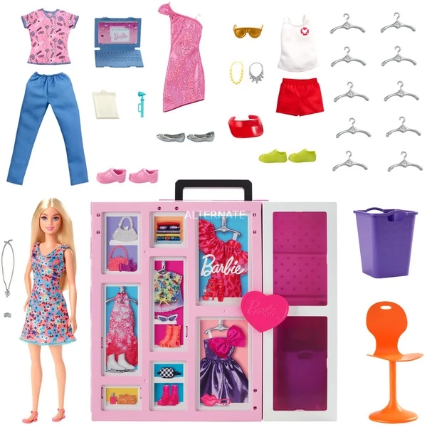 Le Dressing Deluxe de Barbie® inspirera aux enfants une multitude d’histoires et de looks ! Ce dressing rose moderne s’ouvre sur plus de 60 cm et comporte plus de 15 espaces de rangement, avec une penderie escamotable qui forme un deuxième niveau, un vide-linge, un miroir en pied et un coin bureau. Une poupée Barbie® est incluse, ainsi qu’une trentaine de tenues et accessoires. Les enfants pourront utiliser le socle de la poupée et le miroir pour mieux relooker Barbie, mettre le linge sale dans le vide-linge puis profiter du coin bureau pour inventer encore plus d’histoires. Le coffret comprend quatre tenues complètes, dont des accessoires, adaptées à toutes les occasions : une tenue tendance à porter le jour, une autre pour sortir le soir, une tenue d’infirmière et une tenue de maître-nageuse. Et quand ils ont fini de jouer, les enfants peuvent tout ranger et refermer le dressing pour mieux l’emporter partout ! Une jolie poignée facilite le transport. La poupée ne tient pas debout toute seule. Les couleurs et les décorations peuvent varier. À partir de 3 ans.