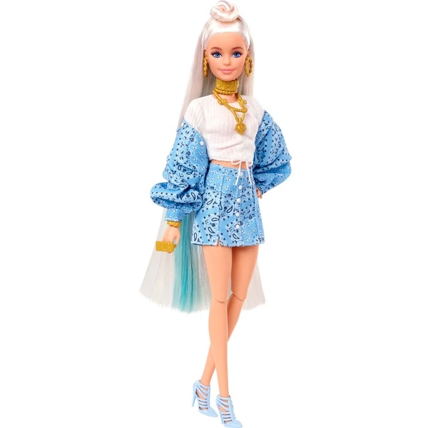 Les poupées Barbie Extra portent des tenues inhabituelles dans des couleurs vives et font une déclaration de mode. Chaque poupée Barbie a un style très unique, ludique et extravagant. Aussi ses amis les animaux tous différents et tous charmants ont leur propre personnalité. Cette poupée Barbie fait sa grande entrée avec des cheveux blonds extra longs avec de la dentelle bleue coiffée d’un dutt sur le dessus de la tête. Elle exprime son style avec une veste bleue avec un motif paisley surdimensionné, une jupe assortie, un haut à la taille blanche et des talons hauts bleus. Un sac à main orange avec texture, des lunettes de soleil en or métallique et de nombreuses couches de bijoux en or inspirent le développement personnel. Votre chiot Chihuahua est également particulièrement mignon avec ses lunettes de soleil Pets Rule et un mini tapis roulant mignon.